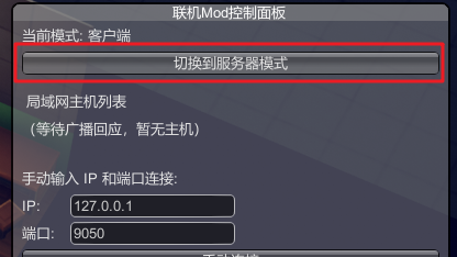 联机Mod控制面板,点击最上面的切换到服务器模式以开启服务器:
