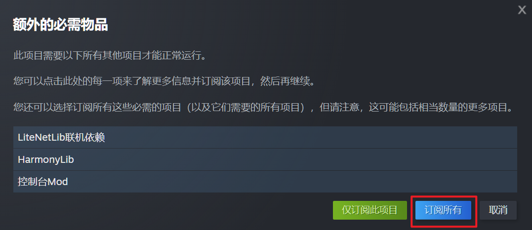 订阅所有按钮,以确保所有依赖 MOD 都被正确下载: