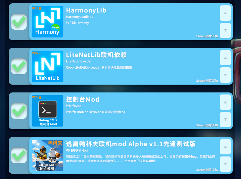 如果您还安装了其他 MOD,请确保图示的四个 MOD 位于最上方,并且顺序和图中保持一致。